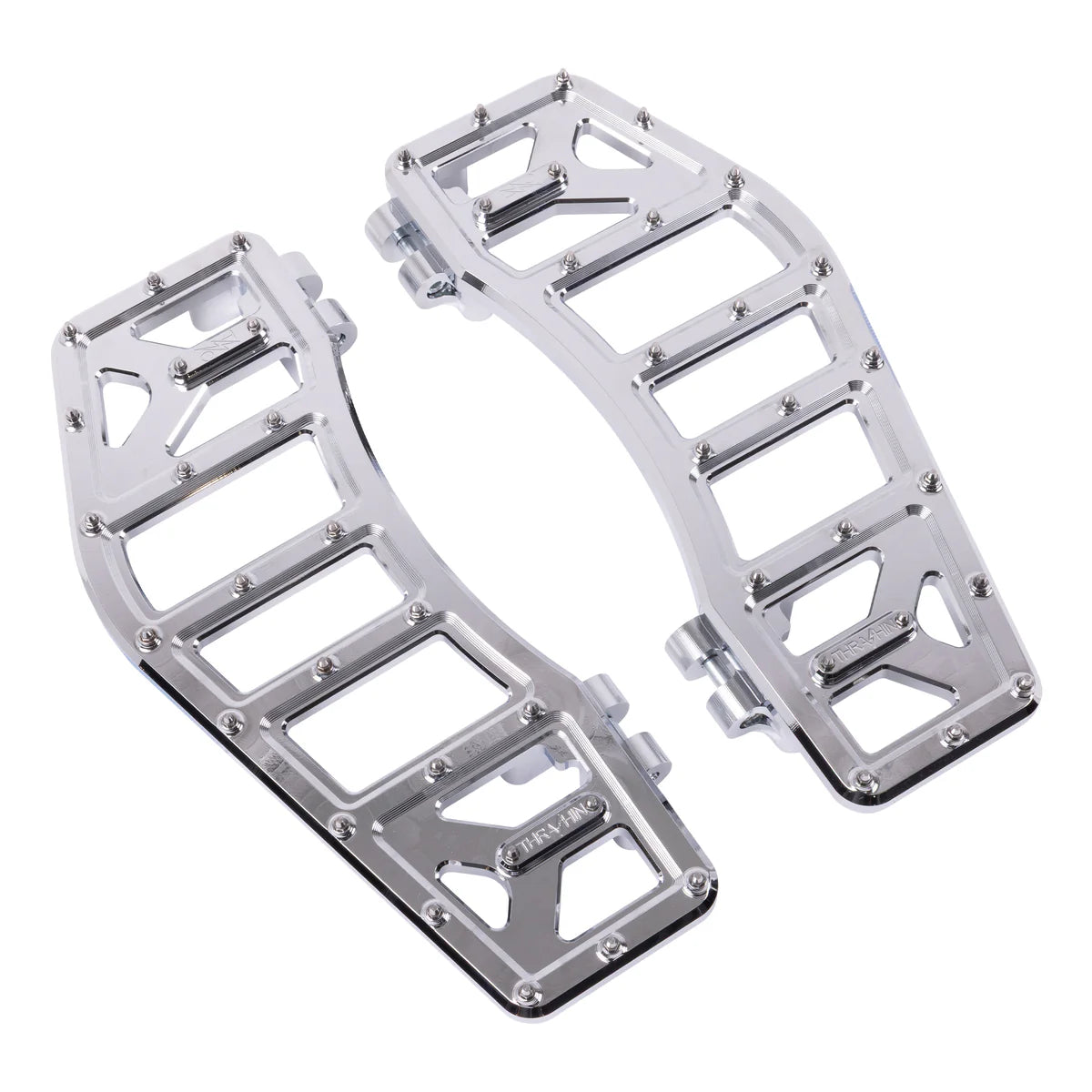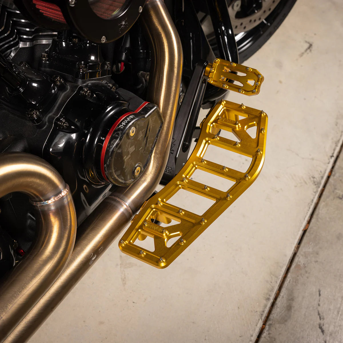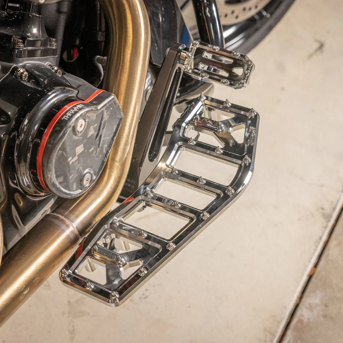 The THRASHIN® Aggressor Floorboards are designed to provide the maximum amount of grip and improve ground clearance while maintaining a sleek and timeless design. Featuring 24 cone-shaped stainless steel cleats per floorboard, and placed on our larger foot-shaped platform, these boards not only look great but will improve the feel of your motorcycle.