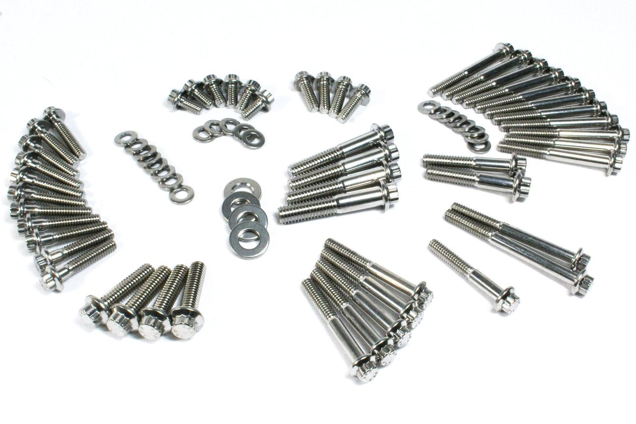 Dyna Kits include polished 12 point stainless bolts and applicable washers for the primary cover, derby cover, inspection cover, transmission top cover, transmission bearing housing, clutch release cover, speed sensor and engine to transmission mounting bolts, loctite and moly assembly lube.
