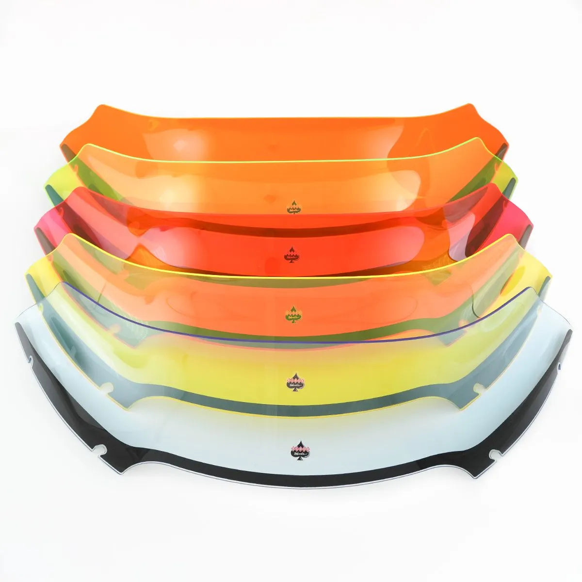 Klock Werks Flare™ is the ORIGINAL windshield of its kind, and has surprised riders everywhere with not only how great it looks, but also with how well it performs. The innovative design features “hips” at the outer edge of the shield that re-route the air to add downforce to the front of the bike, improving stability vs riding with a stock shield. The “flip” at the top of the Flare™ is designed to kick the air up and back as “clean”, less turbulent air for the rider and passenger. The kolored Flare™ motorcycle windshields are made from arcylic and have a vibrant flourescent edge to give your motorcycle a little extra pop! The Sport Flare™ for 2015-2022 FLTR is more streamlined and offers radical curves and a sportier stance. It compliments the lines of the new fairing with a more aggressive profile, and aids stability and handling with improved air management. Still awesome for the long haul, definitely kool for showing off your ride!