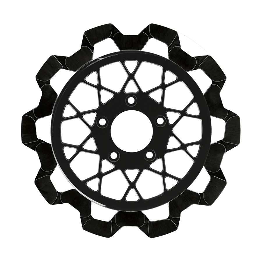 The reduced weight of Lyndall Crown cut rotors enhances rider control by minimizing rotating mass, while the incorporated gas slots effectively outgas debris and gasses generated during friction, preserving the rotor's integrity against brake pad wear and aiding in cooling.