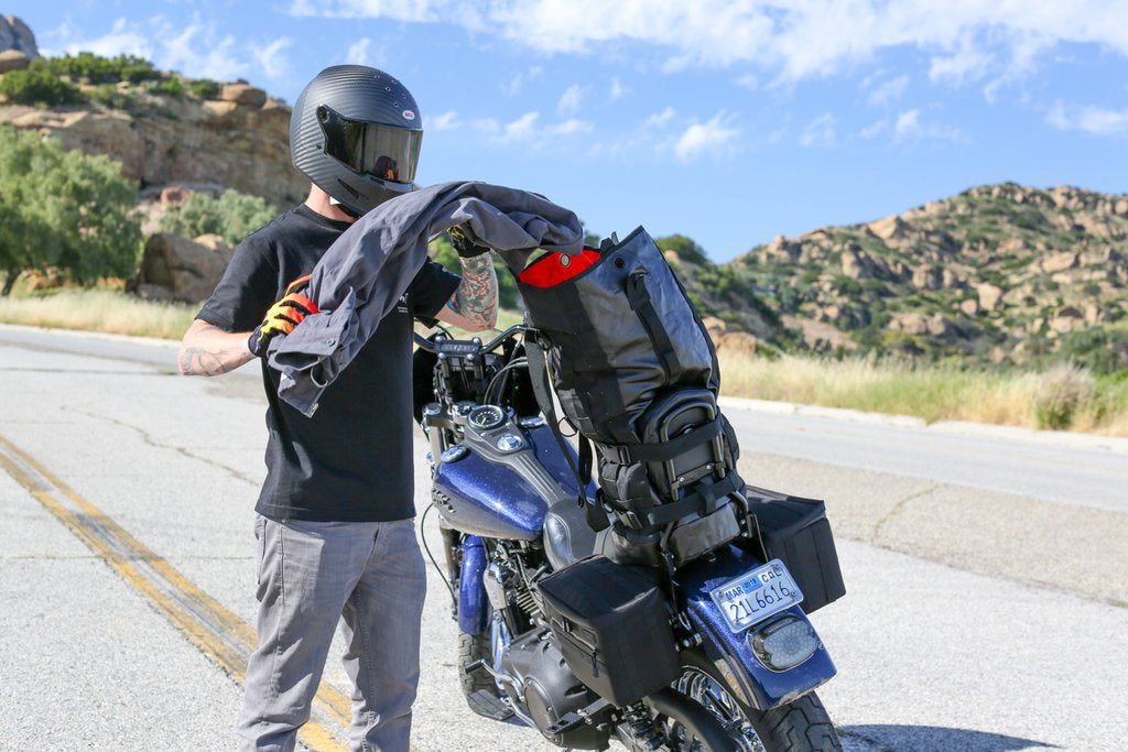 Don't let the weather scare you from leaving the house, The Mission Bag includes our 100% waterproof cover that easily fits over your bag and sissy bar, allowing you to head confidently into the storm! The Mission Duffle Bag also features a Dirty Clothes Divider (DCD), separating the clean from the worn, keeping your clothes fresh for the rest of your trip or until you hit a laundry mat.