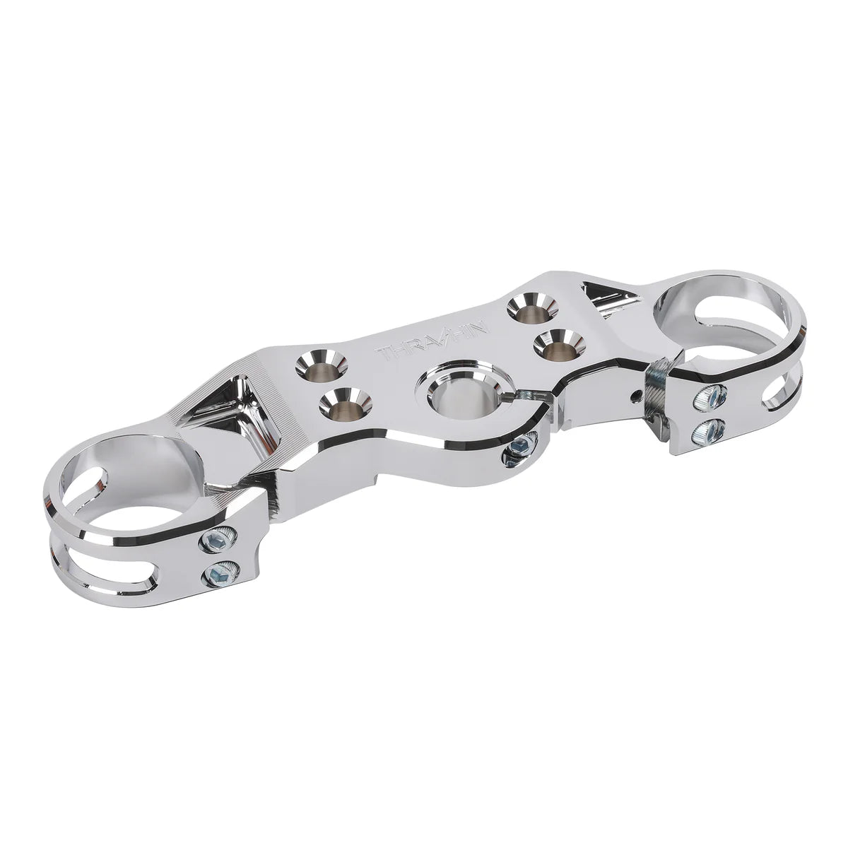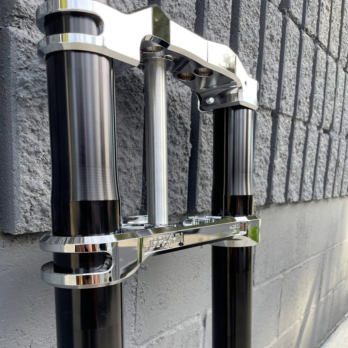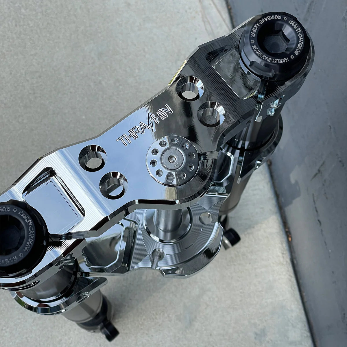 Our innovative M8 Softail Triple Tree kit has two mounting locations for your risers to bolt to, the stock location and a 1.0" closer to rider. Drop tree design allows you to ride your bike at stock ride height or lift up to 1” for increased ground clearance.